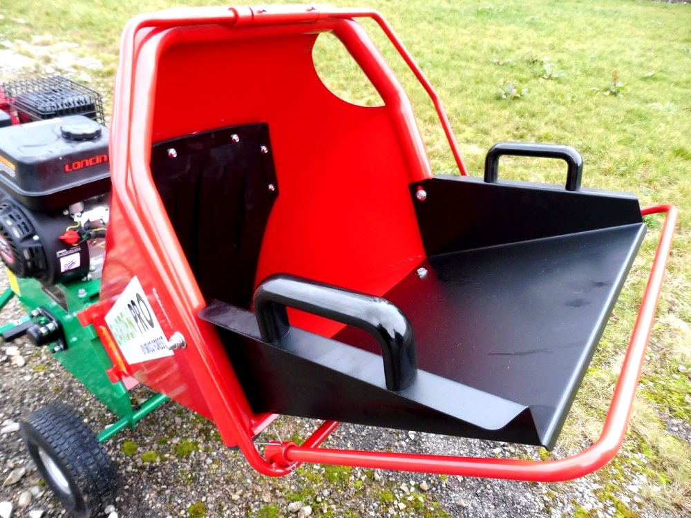 Dieser Gartenhäcksler verfügt über einen einzigen, großen Einfülltrichter, der Äste ohne vorheriges Vorsortieren aufnimmt – im Gegensatz zu Häckslern mit zwei Einfülltrichtern.